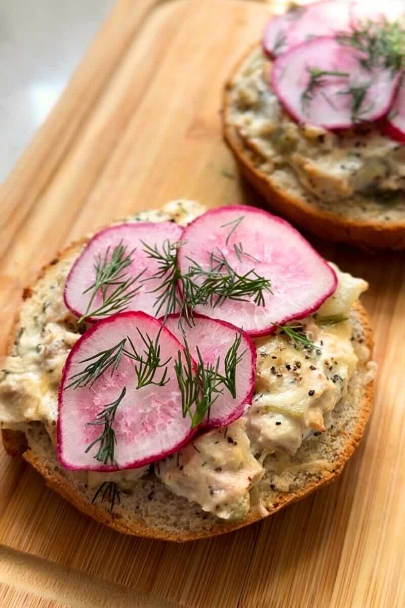 0 Mix the tuna salad. In a medium mixing bowl, add the drained tuna, greek yogurt, mayo, chopped fresh dill, diced dill pickle, shredded havarti, lemon juice, salt, and black pepper. Mix until everything is well combined. 1 Assemble the bagels. Spread the tuna salad over each bagel half. Add a little extra shredded havarti on top if you want it extra melty. 2 Air fry until toasted. Air fry at 400°F for 5–6 minutes, or until the cheese is melted and the bagels are toasted. 3 Add toppings and serve. Top with sliced radishes, microgreens, and extra dill, then serve right away.View original recipe